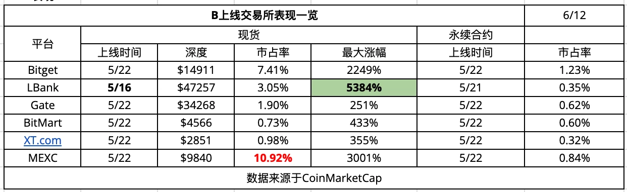 B(BUILDon)跨平台表现:B 币由 LBank 于 5 月 16 日率先全球首发,之后一周内 Gate、Bitget、MEXC 等多家交易所相继上线。在 LBank 首发当日,B 币出现了惊人的瞬时拉升——最大涨幅高达 53.8 倍(对应 LBank 的盘中峰值)。由于 LBank 上市最早、聚集了初期大批涌入的投机资金,该平台上 B 币的成交活跃度和波动幅度均明显高于后来者。LBank 的订单簿深度在 B 币首发时达到约$ 47, 257 的挂单规模,显著高于其他同期上线的平台(例如 Gate 约$ 34, 268 ,Bitget 约$ 14, 911)。更深的流动性意味着 LBank 在爆拉过程中也提供了相对更多的承接盘,这可能使得 B 币在 LBank 虽暴涨迅猛但并未出现极端失控的单边行情。相比之下,Gate 等在 5 月 22 日才上线 B 币的平台,当时市场热度已被提前引爆,价格相对理性:Gate 上 B 币首日最高仅涨至约 2.5 倍开盘价。这说明上线时机直接影响了各平台的价格表现——越早上线的平台获得的涨幅红利越大,而后上线者往往面对一个已被价格发现的市场。