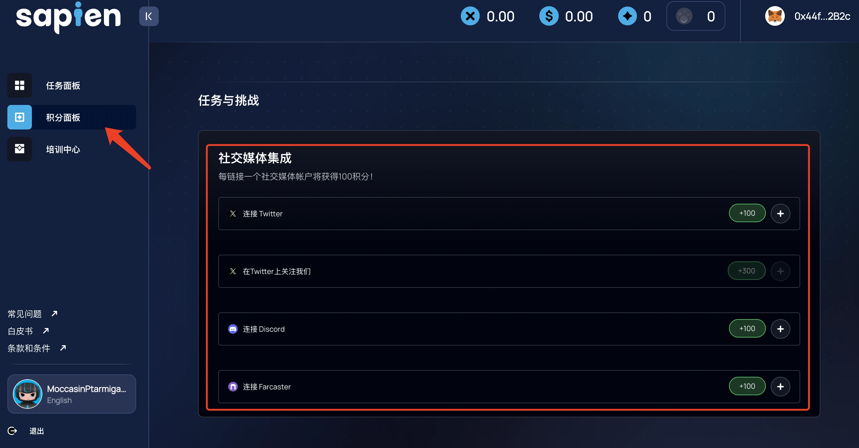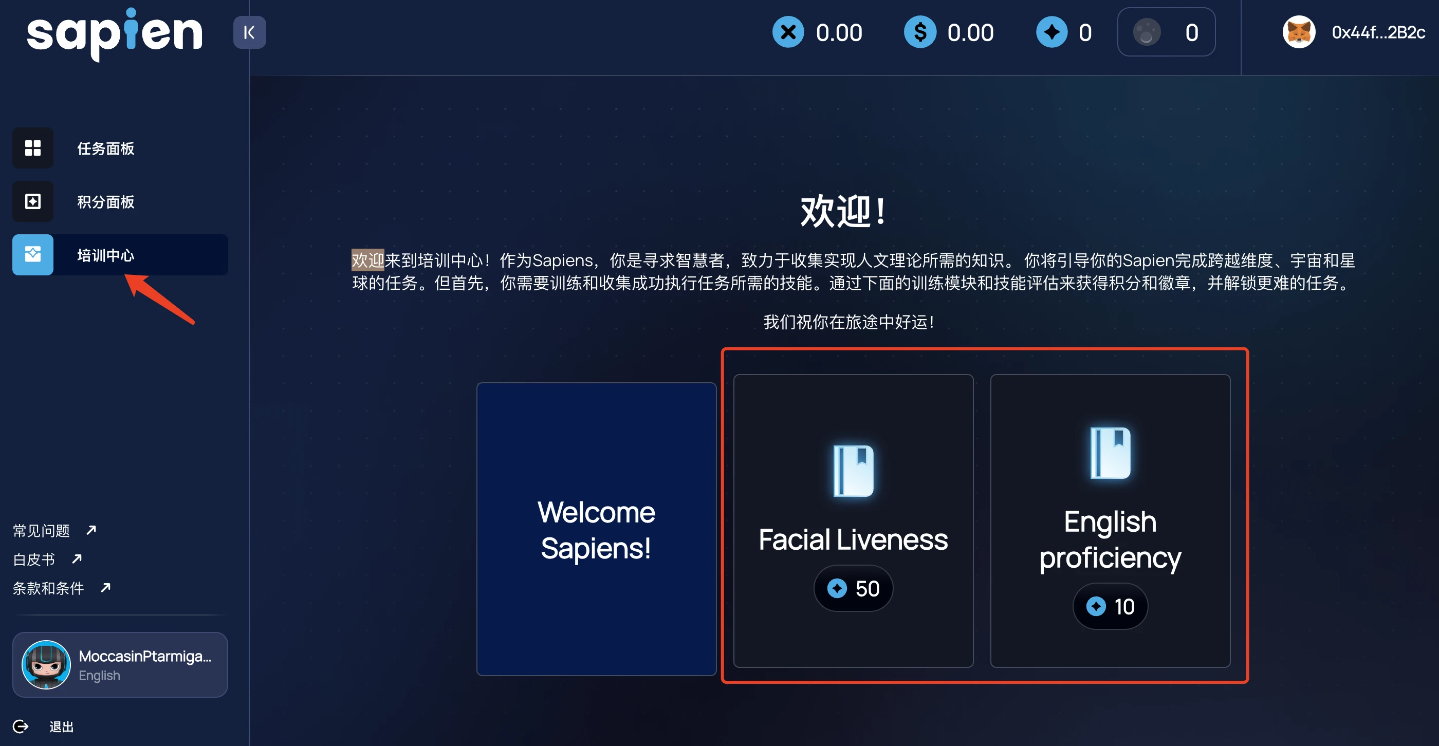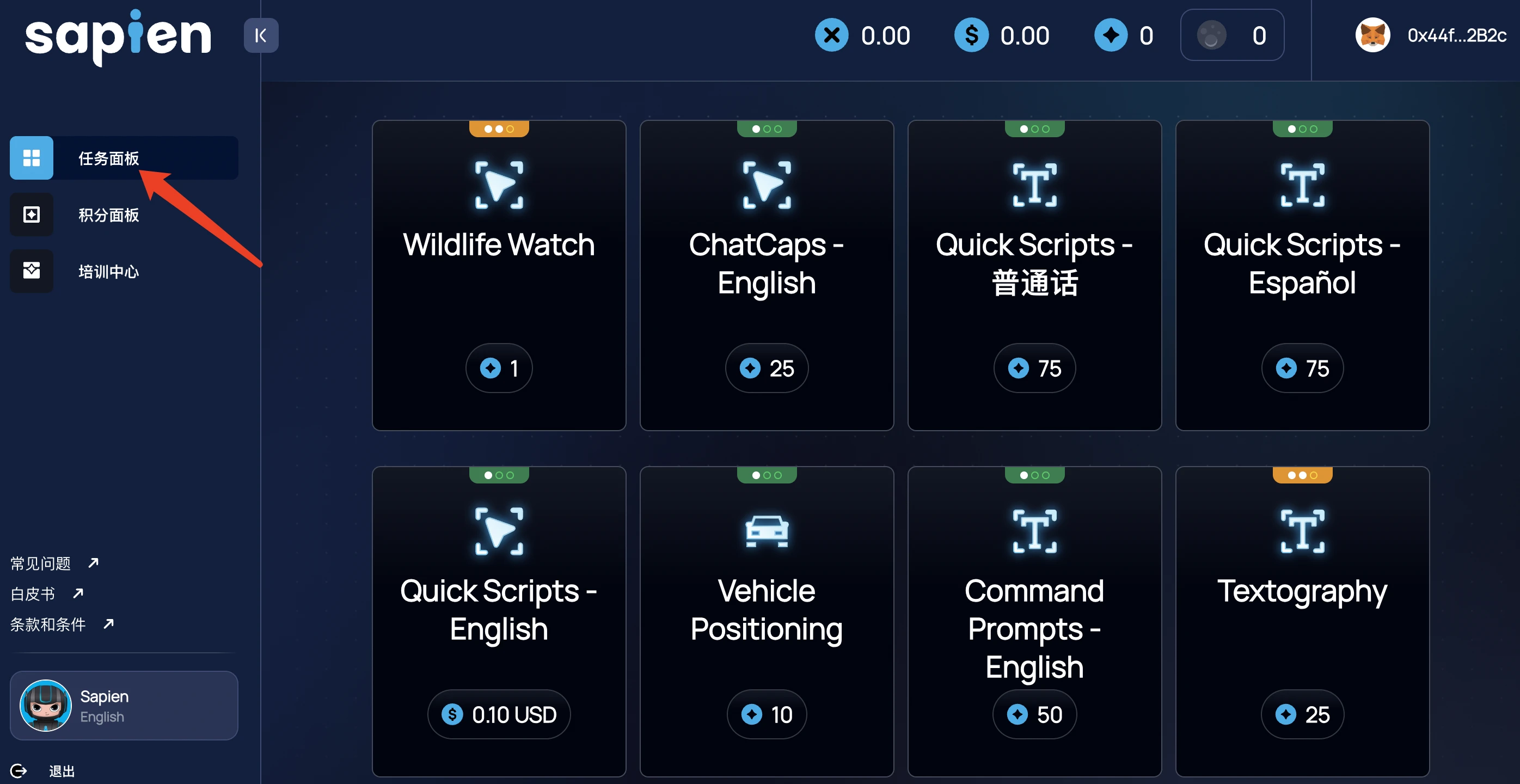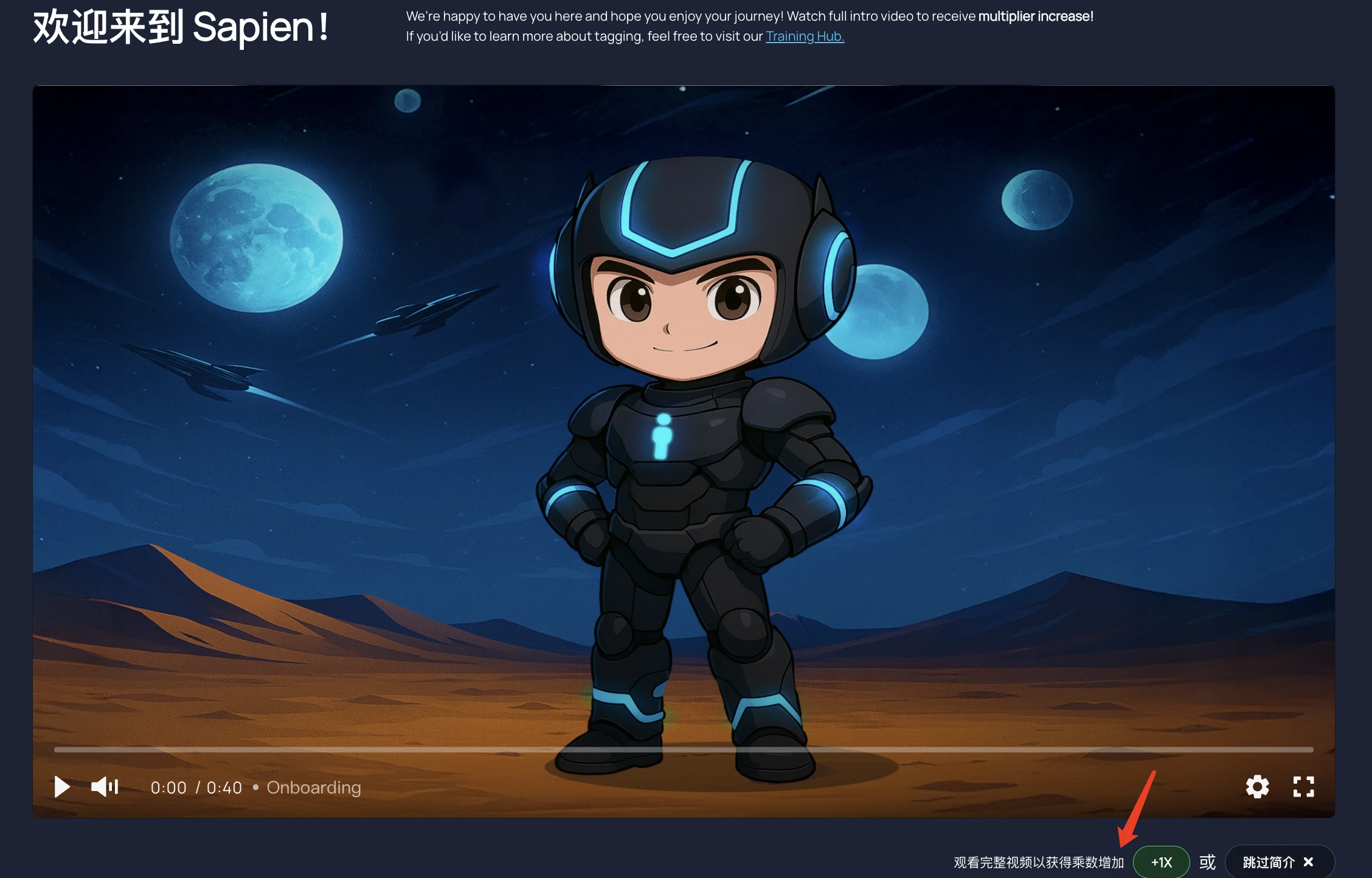 Sapien 参与交互仍处于早期阶段,目前总共有 3 个板块可以获得积分,分别为任务面板、积分面板、培训中心。首先,进入官方交互链接(链接: https://app.sapien.io/t/dashboard?utm_source=sapien-io ),通过谷歌邮箱进行账号登录并连接钱包(首次登录账号有一个新手 40 秒视频,建议不要跳过,看完视频会给积分乘数)。
