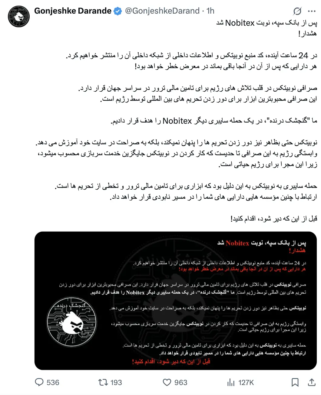 以色列黑客组织「Gonjeshke Darande」(掠食雀)在拿走 8000 万后还没有停手,说会把 Notbitex 的代码发出来,这样平台内就没有一种资产是安全的。