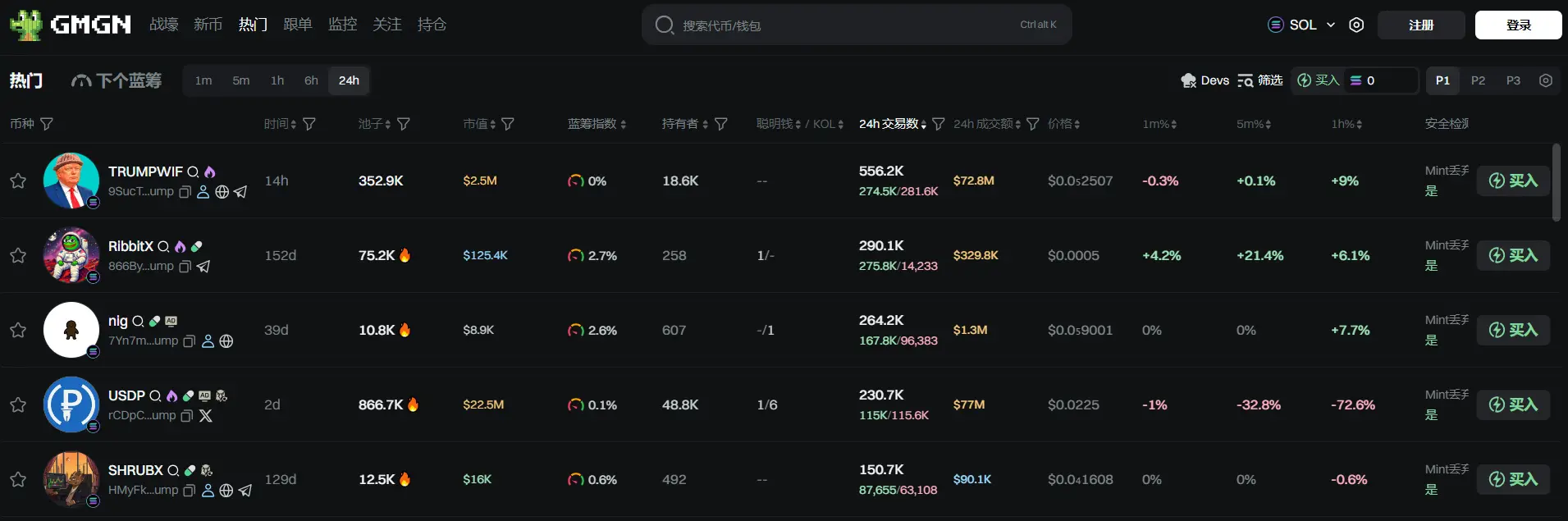 过去 24h Solana 热门代币前五依次为:TRUMPWIF、Ribbitx、nig、USDP、SHRUBX