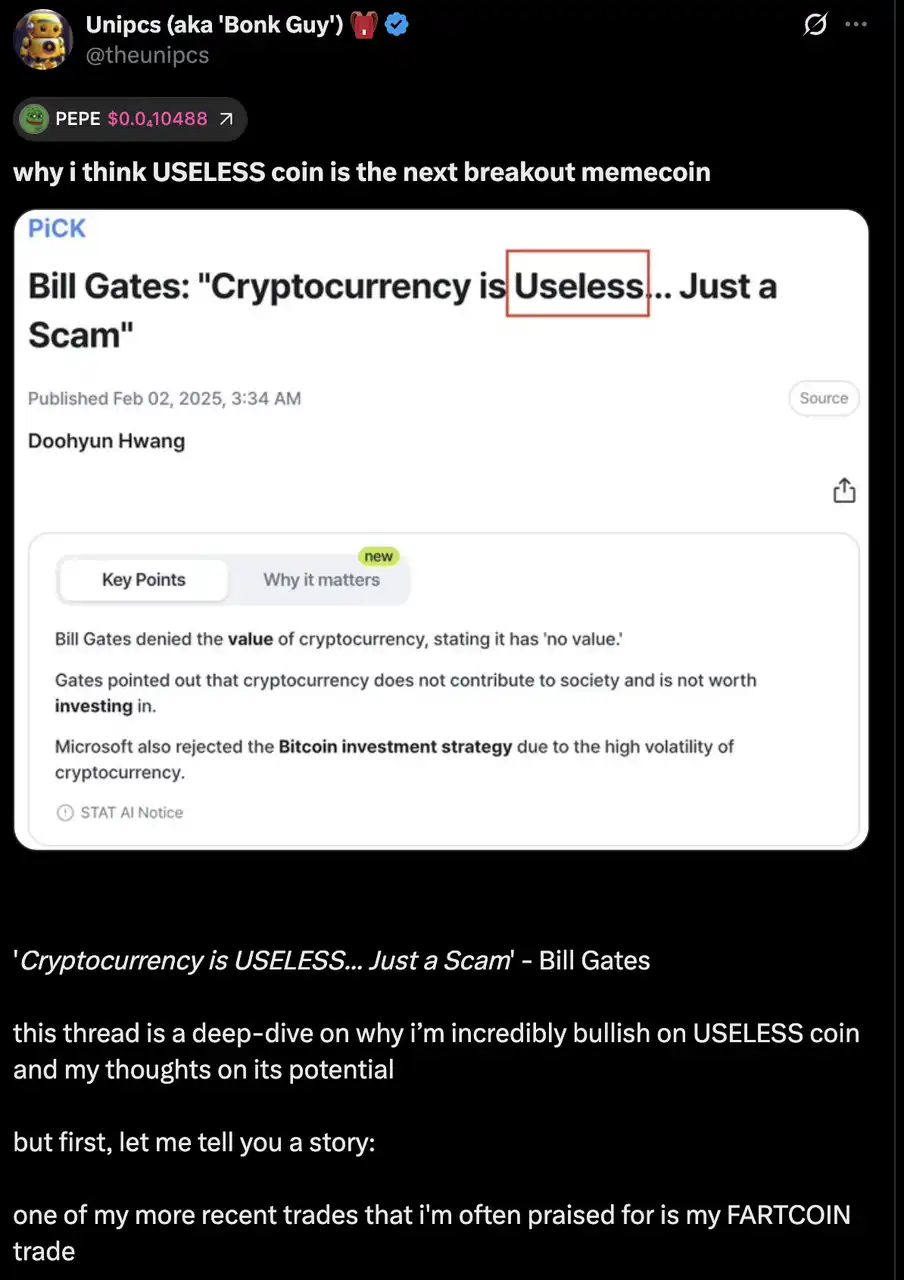 「如果你错过了 $PEPE、错过了 $FARTCOIN,那么这次你最好认真看一眼 $USELESS。」这是 Bonk Guy 多次长文推荐并重仓的标的。它的叙事就在于用「Crypto is useless」这句来自 Bill Gates、Jamie Dimon 等主流精英的嘲讽,反向构建一套自嘲、无用、却极具病毒传播性的 Meme 叙事体系。