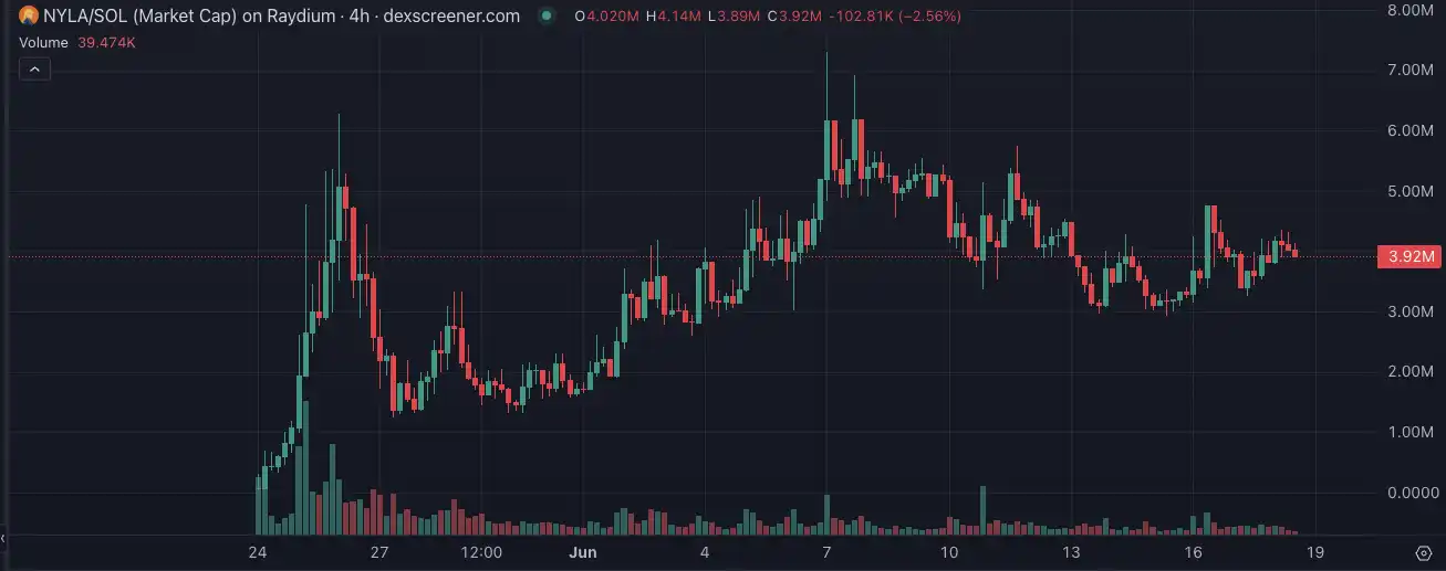 NYLA 的功能围绕「推文即操作」展开:是结合了 Eliza 和 Siri 的 agent,可以通过 X 发帖来交易、转账、发币、存档,甚至未来还将接入链上资金分析与智能 CA 跟踪,代币市值一度接近 10m。