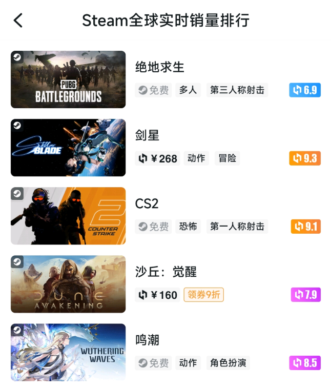 在占据收入大头的PC端,《鸣潮》的表现则更加强势,不仅顶着DNF、LOL等热门产品周年庆、名人堂活动的节点,登顶了wegame畅销榜,还在全球最大PC游戏平台steam里挺进全球热销榜第五。