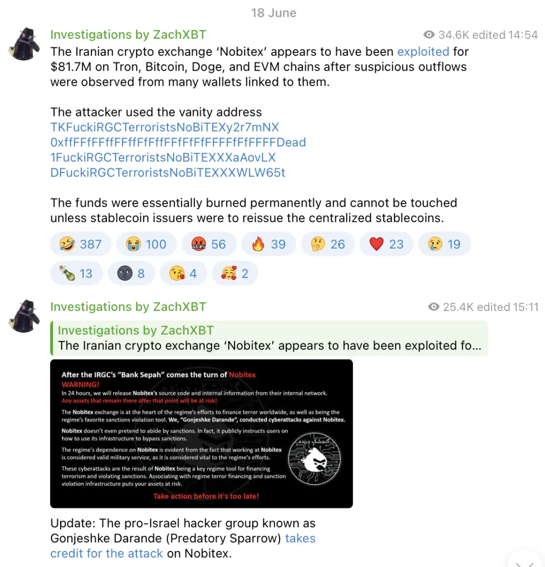 2025 年 6 月 18 日,链上侦探 ZachXBT 披露,伊朗最大的加密交易平台 Nobitex 疑似遭遇黑客攻击,涉及多条公链的大额资产异常转移。