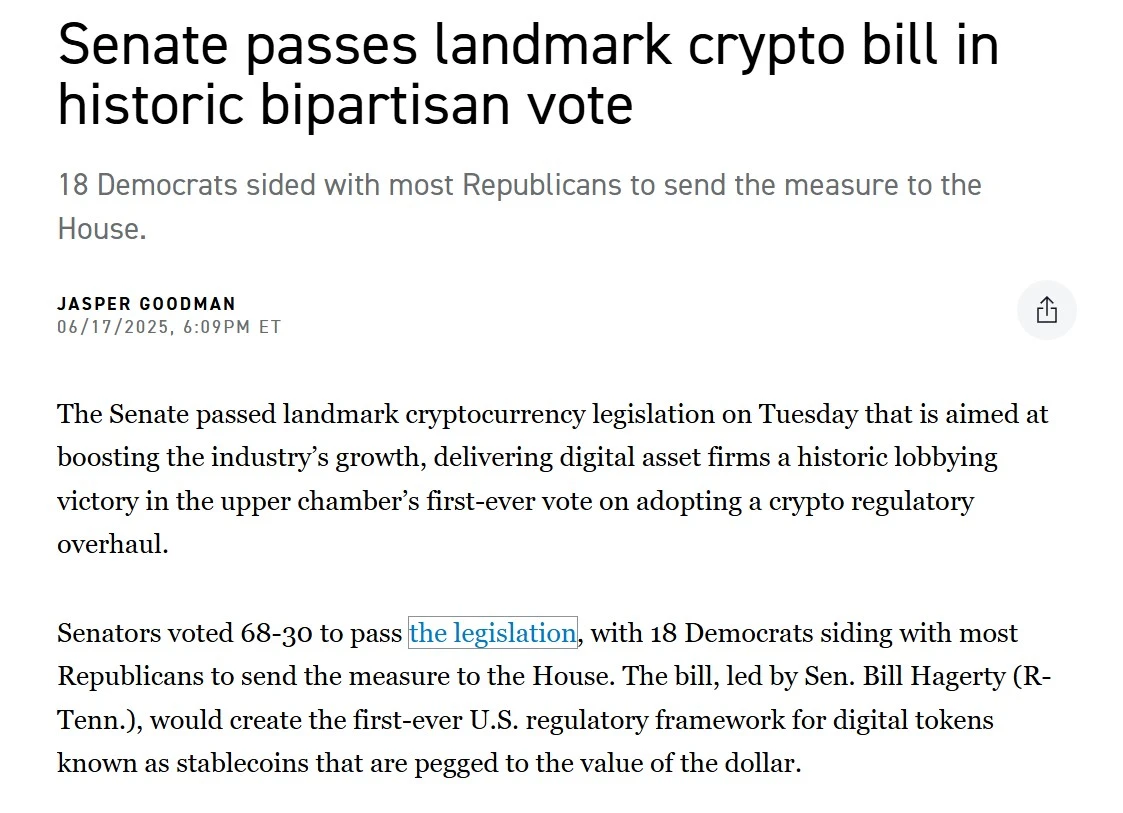 有趣的是,就在 Infini 宣布关停的前后脚,北京时间 6 月 18 日凌晨,美国参议院以 68 票赞成、 30 票反对通过了被誉为加密支付立法里程碑的《GENIUS 法案》。该法案大概率将在特朗普任期内完成众议院审议并正式签署生效。