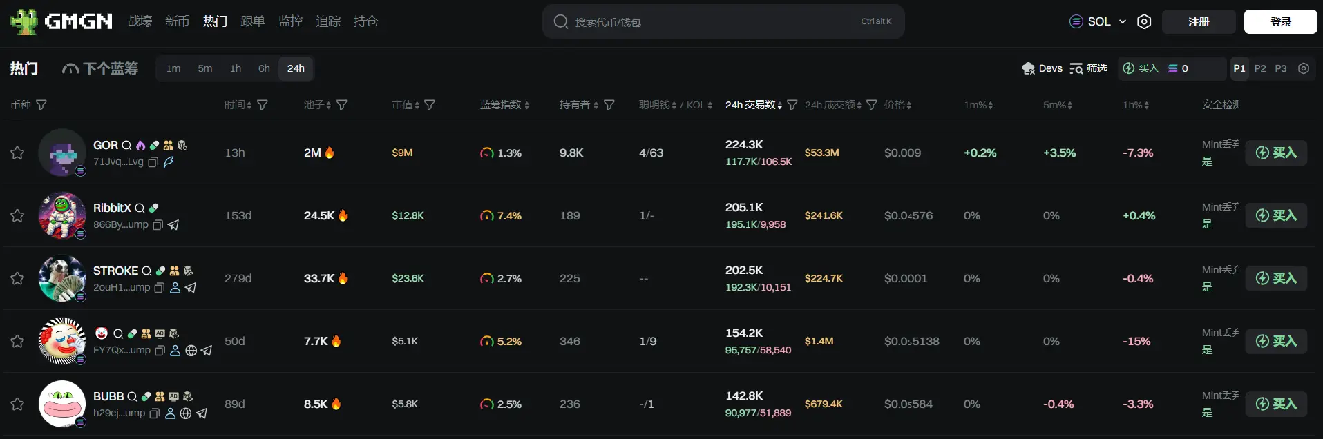 过去 24h Solana 热门代币前五依次为:GOR、Ribbitx、STROKE、 ? 、BUBB