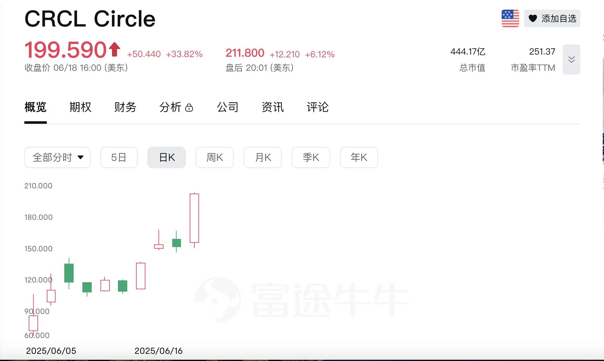 截至6月18日收盘,Circle(CRCL)股价报收于199.59美元,总市值达到444.17亿美元, 逼近旗下稳定币USDC的流通市值(约615.3亿美元)的七成以上。当天单日成交量达到惊人的6300万股,超过上市第二日创下的6070万股纪录,创历史新高。从盘中最高价215.7美元来看,较其IPO发行价31美元累计涨幅高达595%,足以可见市场的参与热情。
