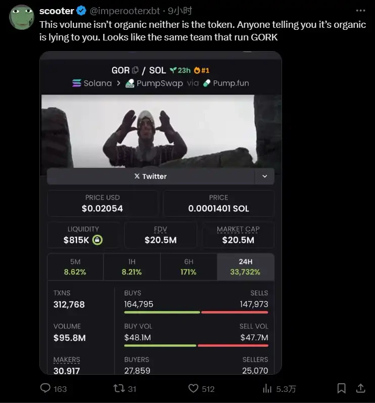 与 Fomo 的散户们不同的是,社区中有一部分观点认为,「Gor」并不像表面看上去那样有趣。@imperooterxbt 直言,该代币由「GORK」同一团队打造,但似乎缺乏可靠证据。
