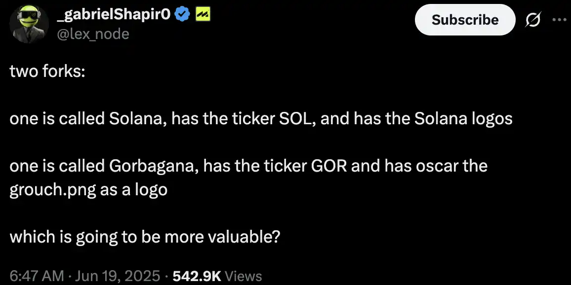 又提出设想如果某天 Solana 分叉,一条保留原名 Solana 与 $SOL 代币,另一条链则自称「Gorbagana」,徽标为 oscar the grouch.png,这一命名方式很容易让人联想到 garbage 的谐音,使叙事更具讽刺意味