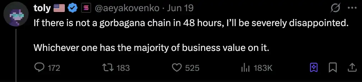 toly 对此的回应是,「如果 48 小时内没人做出 Gorbagana 链,我会很失望。」