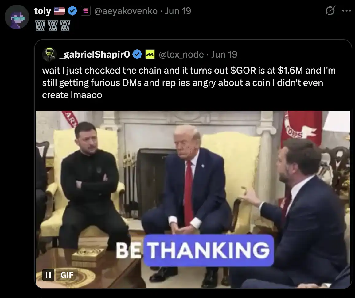 代币市值快速攀升至 160 万美元,并得到了 Toly 的关注,并评论三个垃圾桶的图标,此举引发了社区的彻底 Fomo,$Gor 市值在短时间内一度突破 1000 万美元。