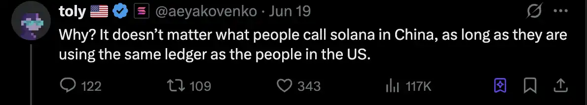 他认为「如果一个公司拥有商标,却没有一个可信中立的规则来决定它的使用方式,那么这个项目就不是真正的去中心化/自治的。」这一事实在他看来,说明所谓「去中心化」在关键时刻其实受制于 Web2 式的法律权力。Solona 的创始人 Toly 对此回应「不管你在哪里,只要大家用的是同一个账本,品牌名称并不重要。」