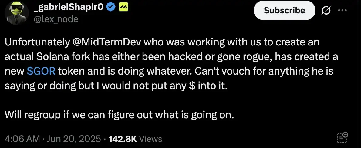 近日,Solona 链上的「Gor」代币 24 小时内涨幅达 400 倍,其市值一度突破了 4000 万美元,而整起事件其实始于 MetaLeX 的创始人 @lex_node 对 Solana 去中心化的担忧,而该话题引发与 Solana 联合创始人的 Toly 在社交媒体 X 上的回复,双方在 X 上的一来一回的交流让该代币背后的理念逐步展现。