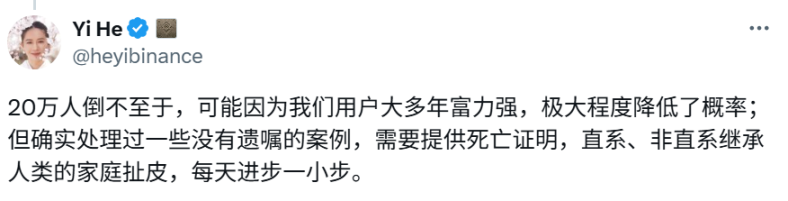币安联合创始人何一公开在推特评论区回应道,币安用户因大多年富力强,极大程度降低了意外死亡概率,但也确实处理过一些没有遗嘱的案例,需要提供死亡证明以及处理过直系和非直系继承的扯皮。