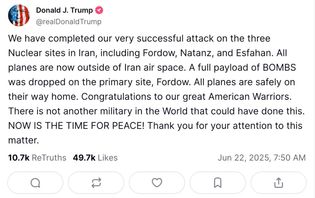 今 (22)晨 07:50,美国总统川普在「真实社群」 宣告 ,美军已对伊朗福尔多、纳坦兹与伊斯法罕三处核心核设施发动空袭,终结近半世纪美国避免直接攻击伊朗本土的惯例,《纽约时报》直指此举已构成「𢧐争行为」。