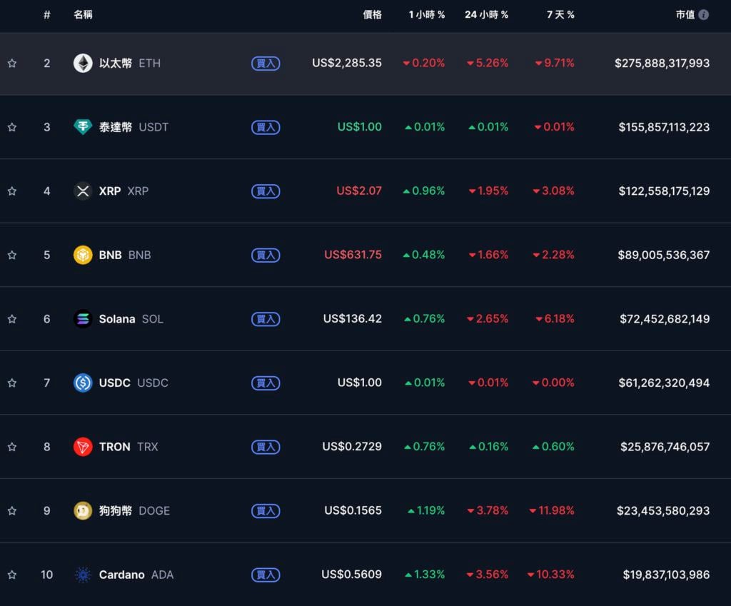其他前十大代币表现也同步受挫,以太坊失守 2300 美元…。