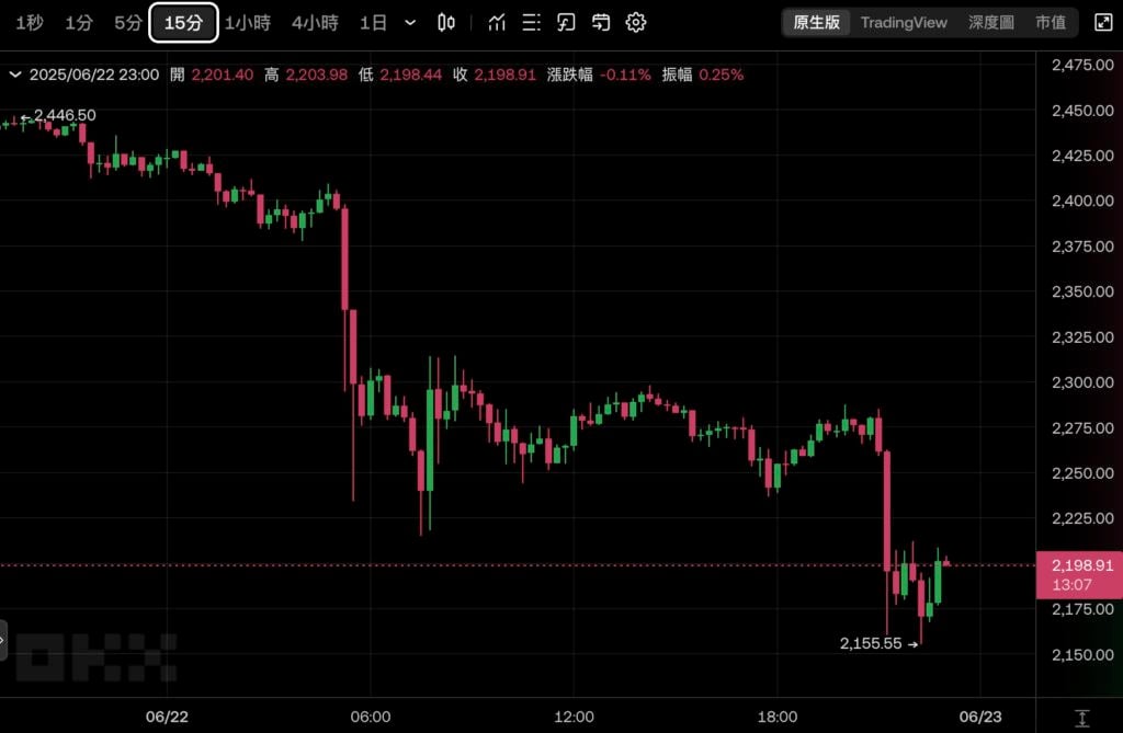 以太坊跌幅更大,跌破 2200 美元,最低下杀 2,155 美元。