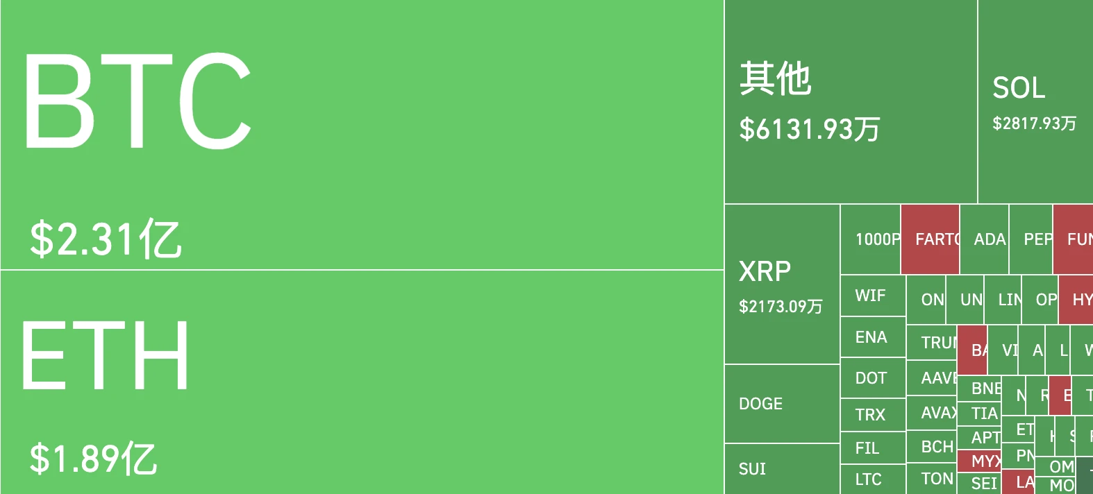 衍生品市场方面, Coinglass 数据显示,过去 24 小时内,全网爆仓金额高达 6.34 亿美元,其中 BTC 爆仓 2.31 亿美元,ETH 爆仓 1.89 亿美元,大部分为多单,杠杆清洗明显。
