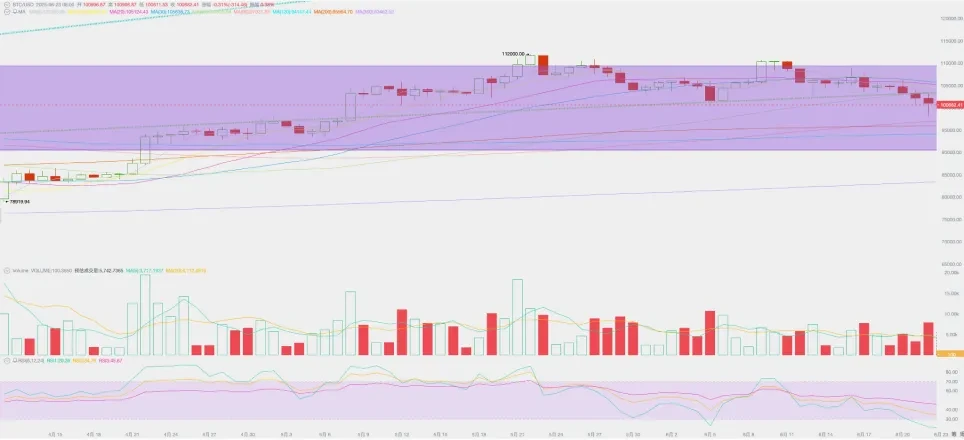 BTC 继续在 102000-109000 美元区间试探,并在周末受美国对伊朗核设施发动突袭而出现短暂恐慌性下挫,随后部分修复。