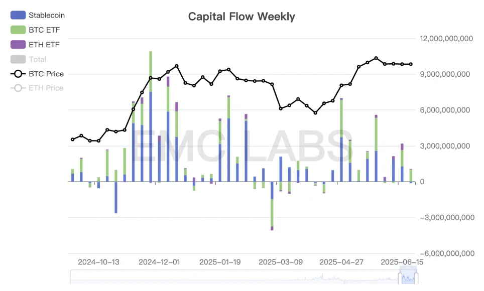 四五月大反弹之后,资金流入出现分化,稳定币通道资金开始减弱,而 BTC Spot ETF 通道资金则相对旺盛且稳定。