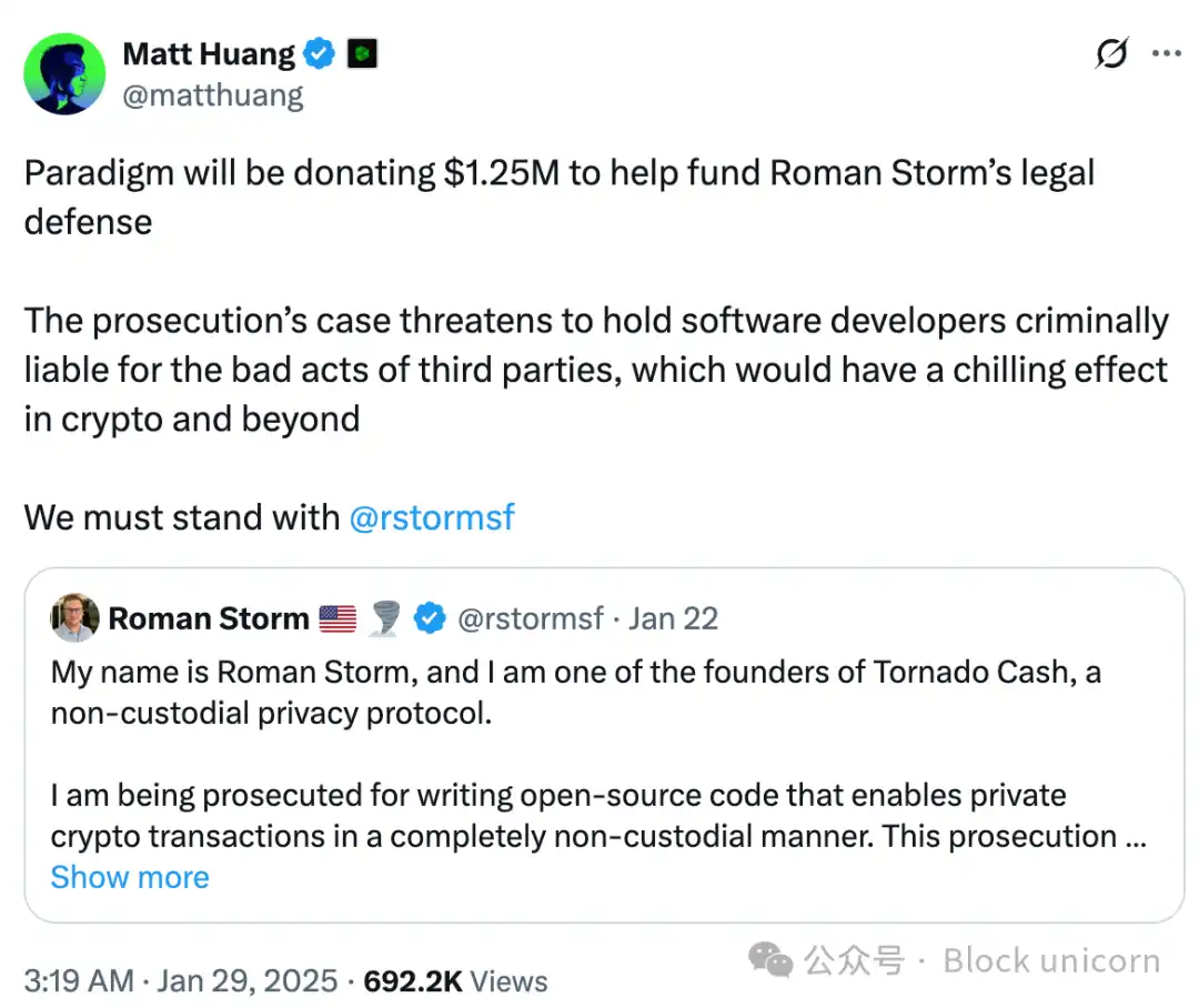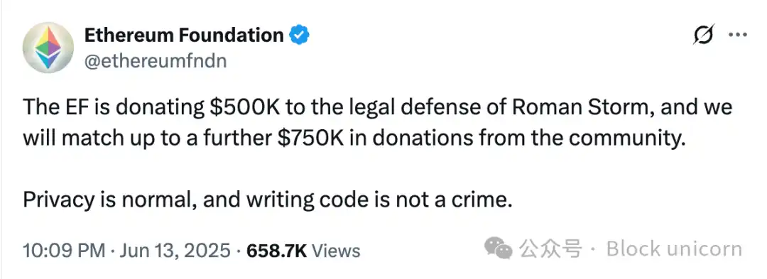 2025 年 6 月 13 日,以太坊基金会承诺为斯托姆的法律辩护提供 50 万美元,并承诺匹配社群捐款高达 75 万美元。他们的宣告直截了当:「隐私是正常的,我们致力于保护那些构建隐私工具的人的权利。」