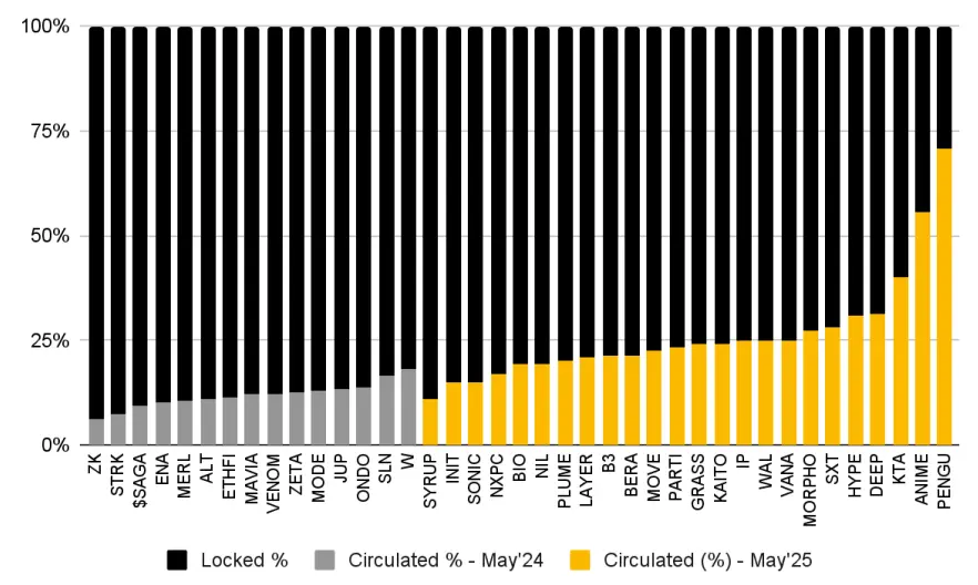 与 2024 年 5 月进行的分析(灰色)相比,近期发行的代币(黄色)的流通量稳步增长。这意味着用户可以“用钱包投票”,选择放弃那些具有不利代币经济学的代币。因此,项目必须适应社区的需求,看到所有项目的流通量都更加健康。