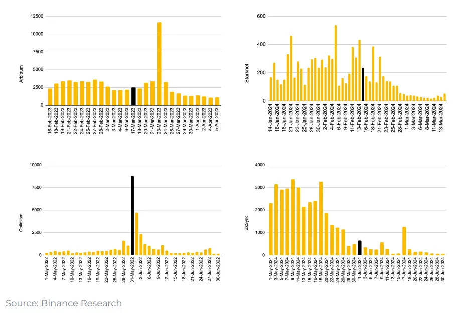然而,空投结束后,通常会看到协议指标(见下图)以及市场估值的下降。这导致了人们对过去两三年常见的“低流通量、高 FDV”发行模式的负面看法。