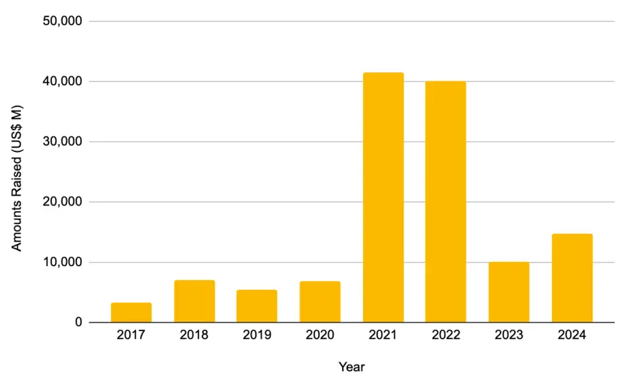 2021 - 2022 年见证了私募融资的爆炸式增长,分别筹集了 414.6 亿美元和 401.2 亿美元。换个角度来看,仅 2021 年的融资额就几乎是 2017 - 2020 年(226 亿美元)融资额的两倍。此后,这种增长模式再未出现。
