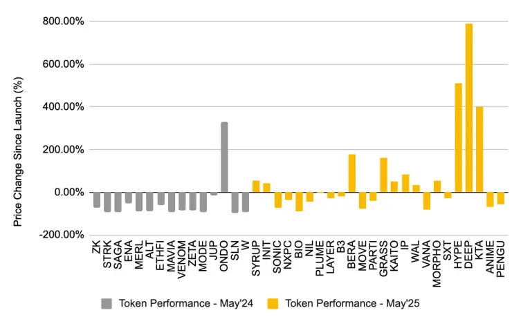 与之前在 2024 年 5 月分析的代币相比,近期以较高流通量和较低 FDV 发行的代币具有更强的价格表现(见下图)。