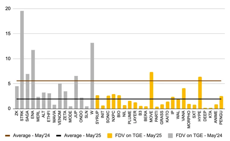 同样,将近期发行的代币与之前的分析进行比较,可以看到,发行时的完全稀释估值有所下降。近期发行的代币的平均 FDV 为 19.4 亿美元,而之前的分析中平均为 55 亿美元。