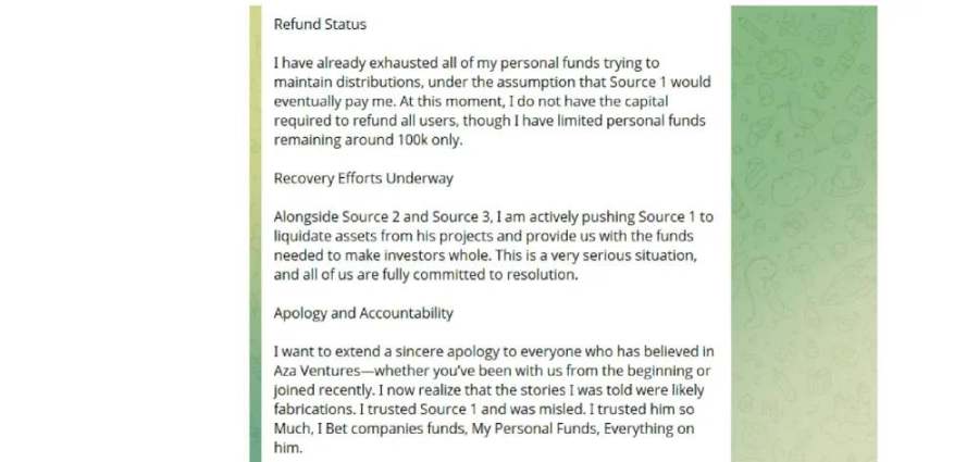 Aza Ventures 指控其主要交易商「Source 1 」正在运营一个庞氏骗局。根据 Aza 的说法,早期交易是真实的,但后期交易完全依赖新投资者的资金来履行之前的承诺——这正是典型的庞氏骗局模式。