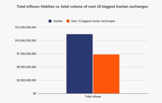 本次被攻击Nobitex是伊朗规模最大的交易所,拥有 600万活跃用户,年交易量高达6800万笔,市占率几乎达到了87%。而路透社曾经对这一项目进行报道,称绝大部分伊朗国内的加密交易通过Nobitex或类似交易所与国际市场对接。