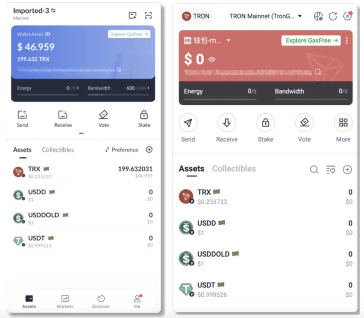 TronLink App(左 1 ~ 2) TronLink 插件(右 3 ~ 4)