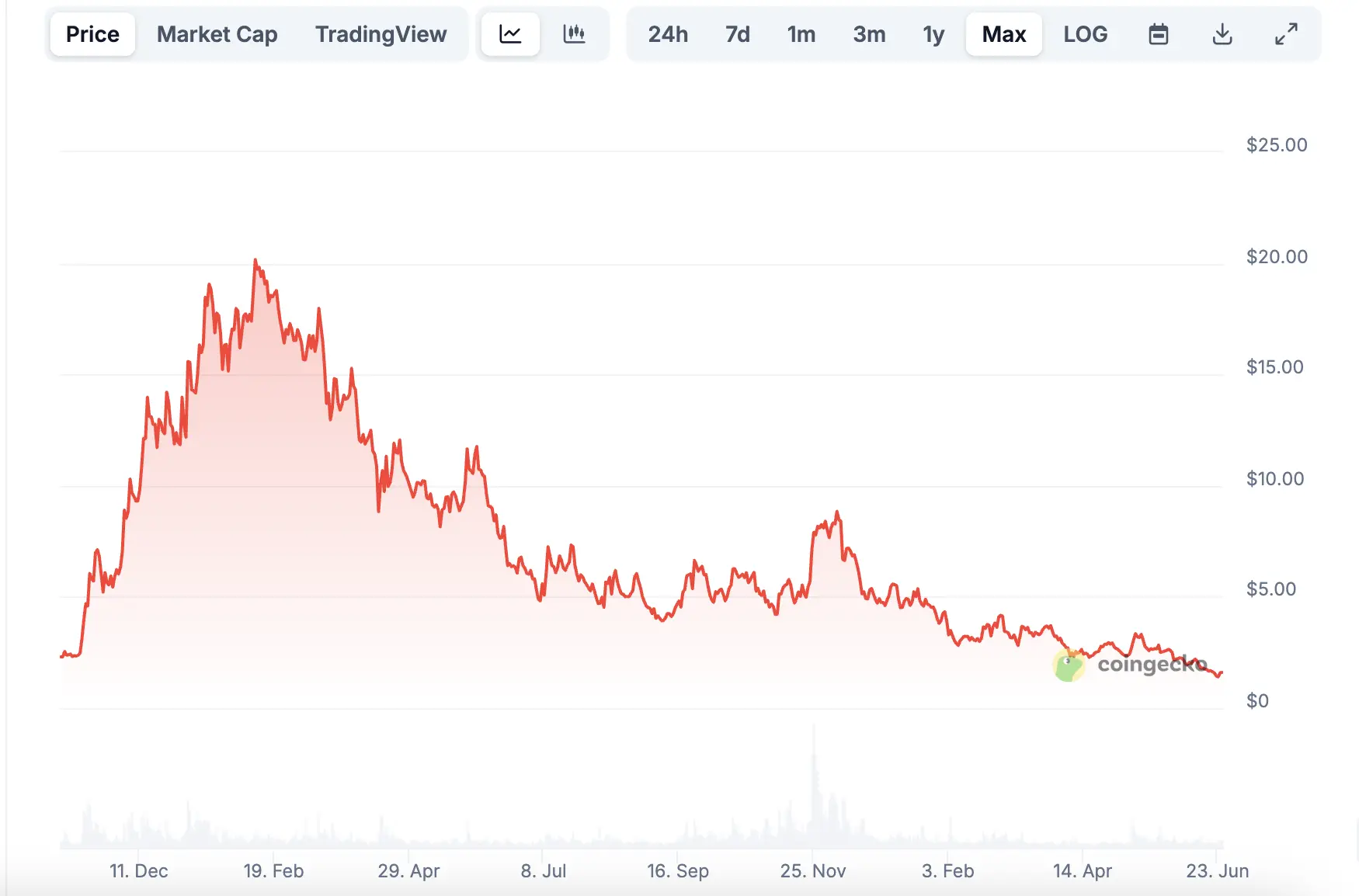 根据CoinGecko数据显示,截至6月24日,TIA价格已跌至1.56美元,较历史峰值约19.07美元大跌91.75%。市值也由巅峰时的逾39亿美元回落至约10亿美元,市场关注度大幅降温。