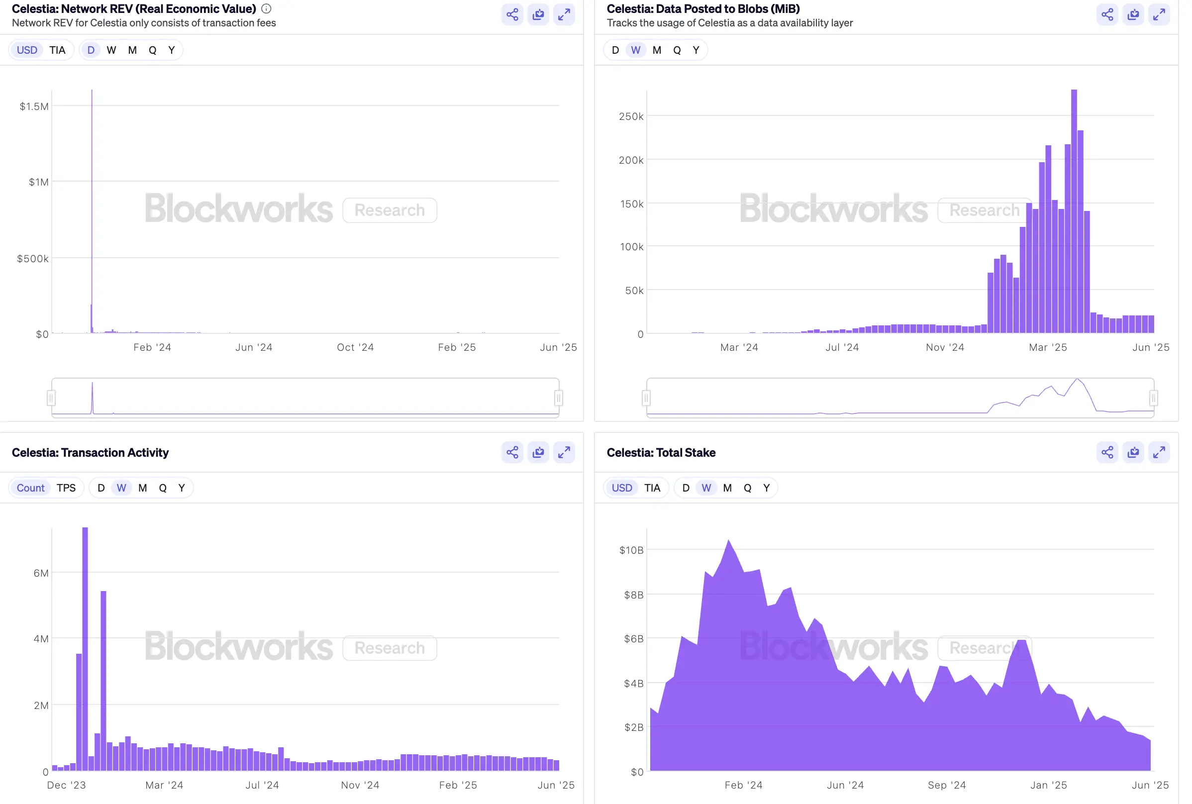 链上活动也同步冷却。Blockworks数据显示,Celestia的实际使用情况大幅下滑。其中,日收入曾在模块化概念最热期间高达160万美元,但截至6月22日,日收入骤降至99.7美元,跌幅高达99.9%;交易笔数亦由峰值580万笔降至每日仅数万笔,这表明生态用户活跃度急剧下滑;传至Blobs的数据量则由峰值279,934 MB锐减至21,135 MB,DA层的核心使用量出现断层式萎缩;另外,TIA质押规模也由百亿美元级别回落至十余亿美元,资本锁仓热情减弱,这或与代币价格波动、投资者信心下降密切相关。