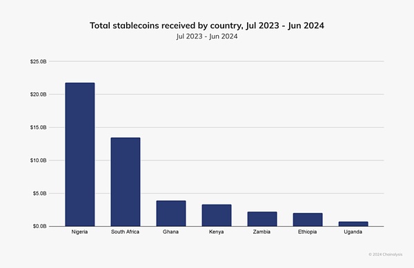 根据 Chainalysis 数据,非洲是加密货币应用增长最快的地区,2022-2023 年至 2023-2024 年的同比增长率为 45%,超过了拉丁美洲等其他新兴市场的 42.5%。这种快速增长凸显了稳定币应用的巨大潜力,尤其是在银行渗透率仍然处于全球最低水平的非洲地区。