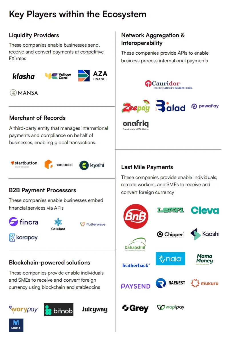 这些是数字支付基础设施提供商,为企业(商家、金融科技公司、中小企业)提供单一 API,以接受多种支付方式,包括移动支付、银行转账和银行卡支付。Flutterwave、Paystack 和 Fincra 等公司使商家能够通过单一集成处理来自多个来源的数字支付。他们专注于数字经济蓬勃发展且银行业正规化的国家,例如尼日利亚、南非、埃及和肯尼亚。他们的收入模式基于商家交易费(1-4%)、API 订阅费以及欺诈检测和即时结算等增值服务。这些聚合器满足了需要无缝支付处理的企业、商家和数字平台的需求。