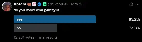 那么 ansem 就问了(玩笑),「你知道谁是 Gainzy 吗」。超过 12000 次的投票,仍然有 34.8% 的投票者选择了「不认识」。即使到了现在,中文圈对 pump.fun 生态明星可能更多地仍停留在 ansem 阶段,确实对 Gainzy 不熟悉。