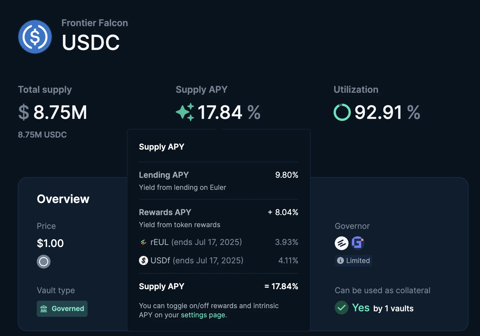 熟悉循环贷玩法(尤其是 PT 循环贷)的用户当下可以立即操作起来,追求更高收益; 不太熟悉或是不太愿意折腾的用户则可选择提供 USDC 作为 lender,当前在 Euler Finance 提供的激励之下,提供 USDC 的 APY 可以达到 17.84% ,收益率还是蛮香的。