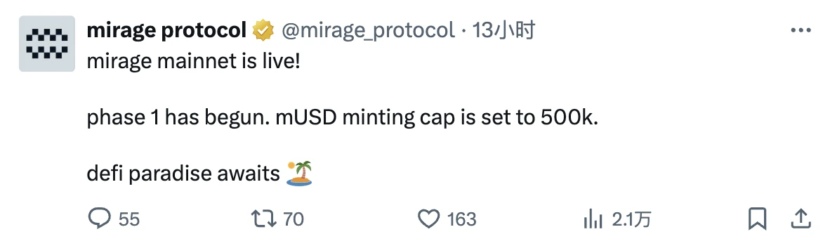 该项目今日已启动主网第一阶段,开放了 50 万美元的 mUSD 铸造额度。