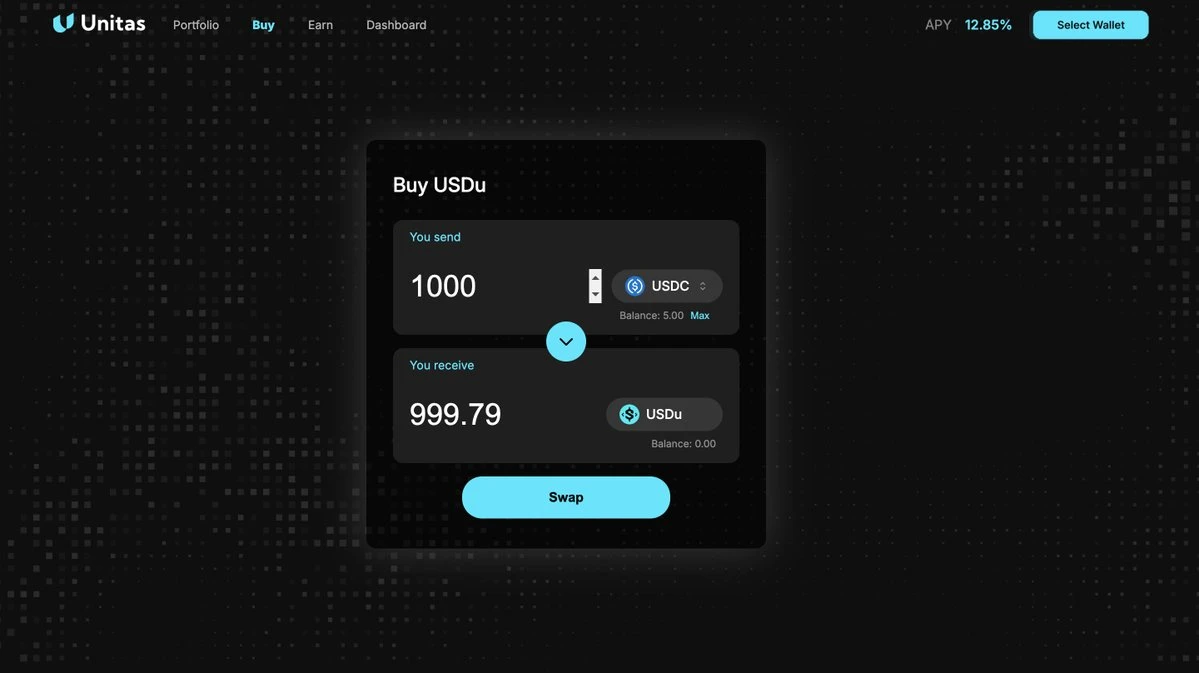 Unitas 允许用户铸造稳定币 USDu 并质押产生收益(解质押需要 7 天),其生息模式类似于 Ethena 的期现套利,当前实时 APY 为 12.85% 。