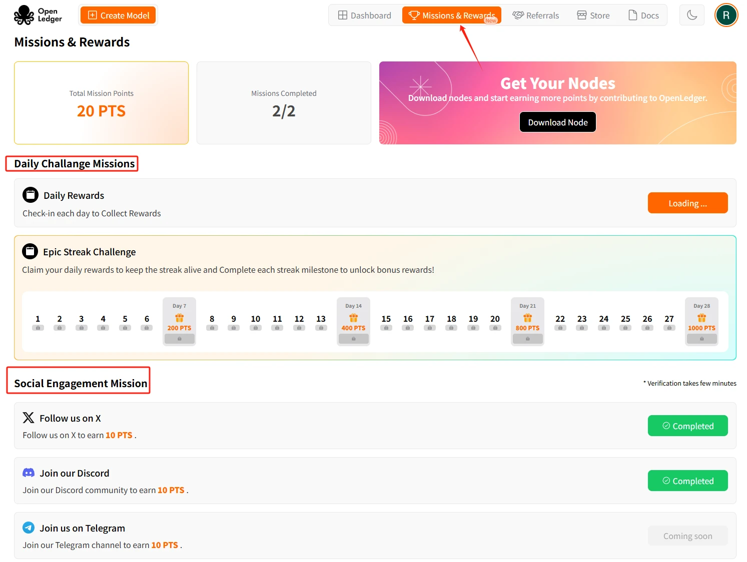 STEP 1. 进入交互链接后,点击“Missions&Rewards”板块,首先完成社交类任务,获得 PTS 积分奖励。此外,参与每天签到获得 PTS 积分奖励,并且连续签到 7、 14、 21、 28 天有额外积分奖励。