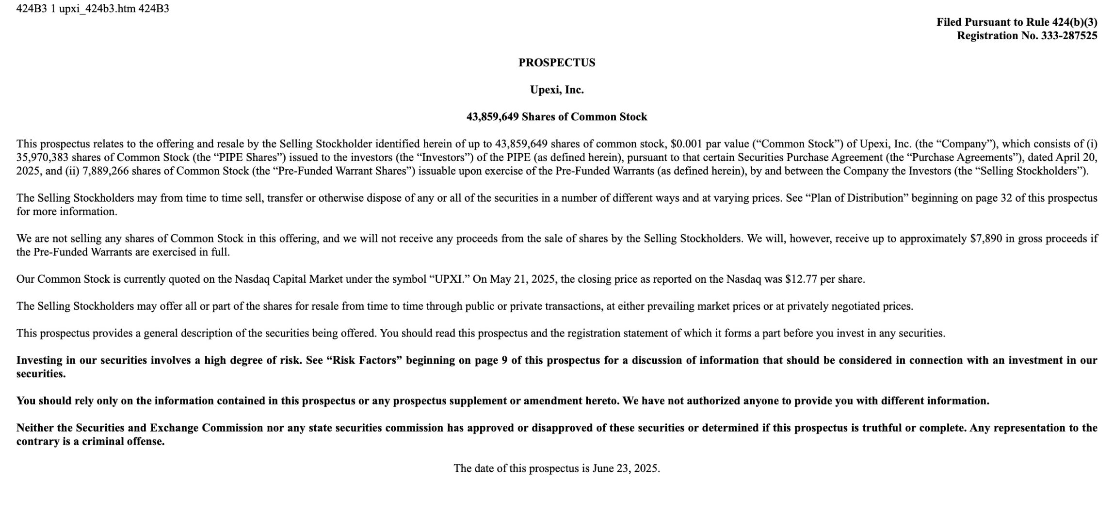 Upexi 提交给美国证券交易委员会的文件中写道:「我们不会在此发行中出售任何普通股,也不会从出售股东出售股票中获得任何收益。」
