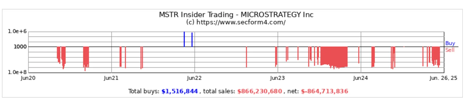 Strategy ,这套“无限增长”理论的提出者,其内部高管一直在减持手中股票$MSTR。据SecForm4.Com 数据显示,自 2023 年 6 月以来,Strategy 内部人士进入集中抛售期。Protos报道指出,仅过去 90 天内,高管累计出售股票总额已达 4000 万美元,卖出次数是买入次数的 10 倍。