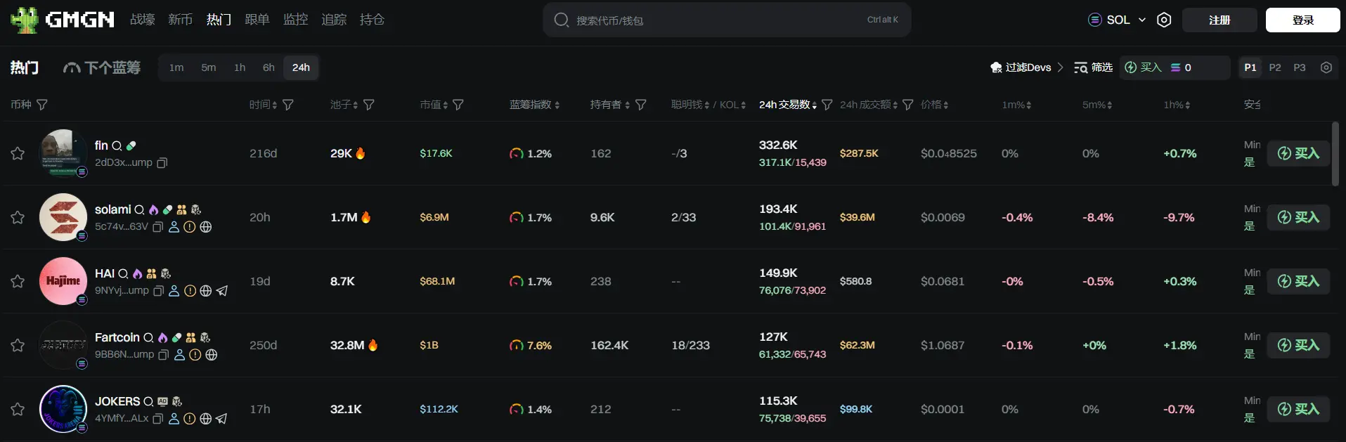 过去 24h Solana 热门代币前五依次为:fin、solami、HAI、Fartcoin、JOKERS