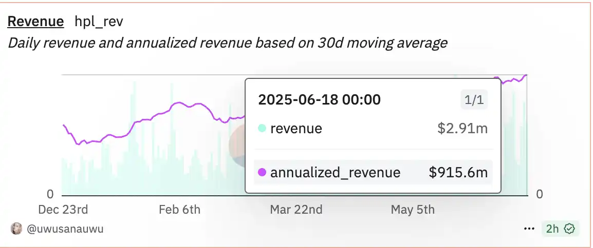 随着 Hyperliquid 近期的活跃,其主网的 TVL 已经跃升至公链前 10 ,而 $HYPE 市值也已跃升至所有加密货币第 11 名,其参与人数逐步上升,平台单日手续费能够维持在每日 200-300 万美元,平台年收入已经接近 1 亿美元。