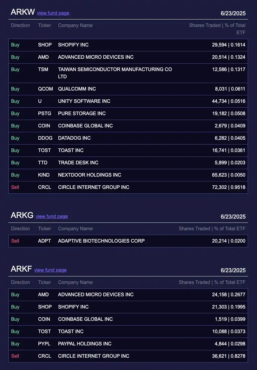 据 Ark Invest Daily 数据显示,Cathie Wood 旗下 ARK Invest 于 6 月 23 日减持 415, 844 股 CRCL,按当日收盘价计算,总价值约 1.095 亿美元。与此同时一天共增持 20, 701 股 Coinbase,现价值约 714 万美元。并在 23、 24 日连续两日加仓与 Coinbase 深度合作的 Shopify,共买入 146, 487 股,现价值约 1676 万美元。
