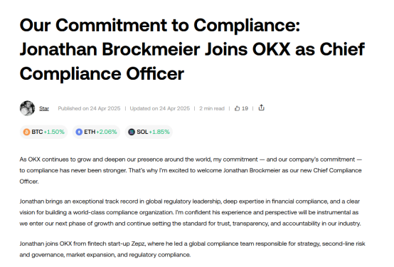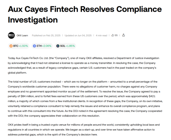 从时间线来看,早在去年3月,在吴说的一篇报道中,就提到OKX内部已把位于美国的合规部门调整为所有部门的最高优先级。今年2月,OKX宣布子公司Aux Cayes FinTech Co. Ltd.与美国司法部达成和解,承认因历史上合规控制的不足,曾经有一小部分美国客户在该公司的全球平台上进行了交易。根据和解协议,OKX同意支付8400万美元的罚款,并放弃在此期间从美国客户获得的约4.21亿美元的收入,总计用5亿美元解放了历史包袱。