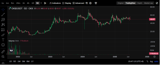 实际上,正如上述所说,近年来,OKX对于OKB的态度相当微妙,虽有尝试定期通缩稳定价格,但在代币赋能方面远远不如币安对BNB般积极主动,既无抵扣手续费,也无打新收益,直接导致的结果就是,OKB保持着不温不火的价格。在近一年中,OKB多在40-50美元区间震荡,本质上来看,OKB是一个被高度控盘的币种。从其上市传言的走势而言,市场上对OKB的未来看好程度非常有限。有持有者就戏言称,持有就像买彩票,坐等敲钟时可能出现的资金炒作。