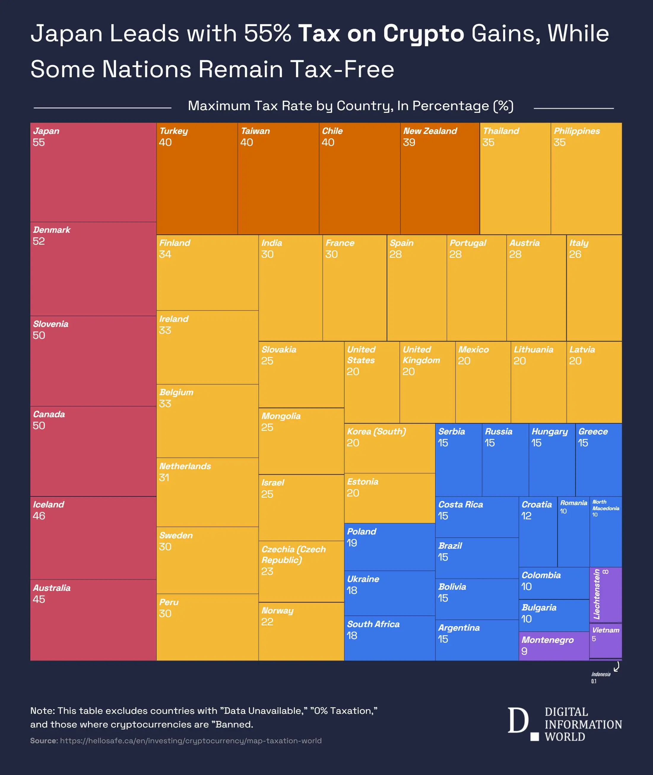 在日本,加密货币交易所得被归类为 杂项收入(Miscellaneous Income) ,适用累进税率,最高可达55%(包括地方税)。这一税率适用于个人投资者直接持有并出售加密货币所产生的收益,无论是通过交易所交易还是点对点交易。